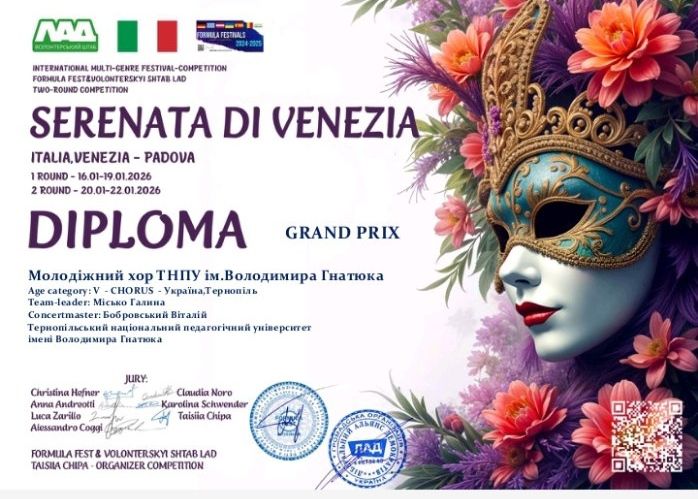 Друзі,хочу поділитися надзвичайною новиною,наш виступ ,вперше за час існування колективу,оцінили найвищою відзнакою, Гран-прі Міжнародного конкурсу(Італія). Велика подяка команді професіоналів,яка працювала над створенням відеороботи “Ой прилетіли,два соколоньки”.Безмежно пишаюсь талановитими студентами Молодіжного хору,які гідно представляють рідний університет ТНПУ ім.В.Гнатюка!!!!!
