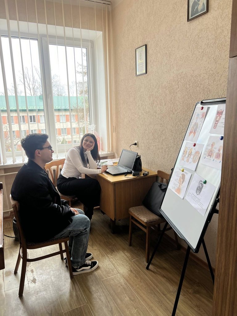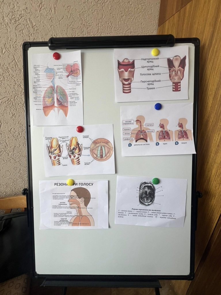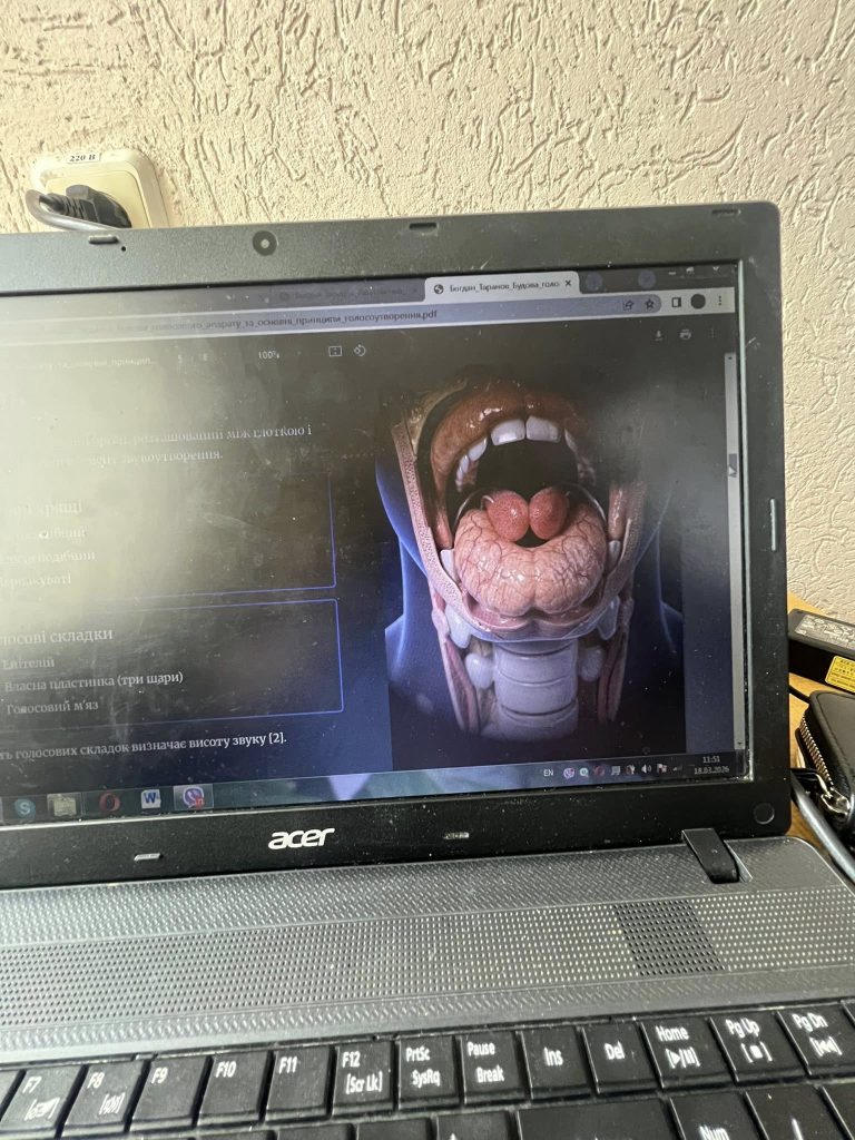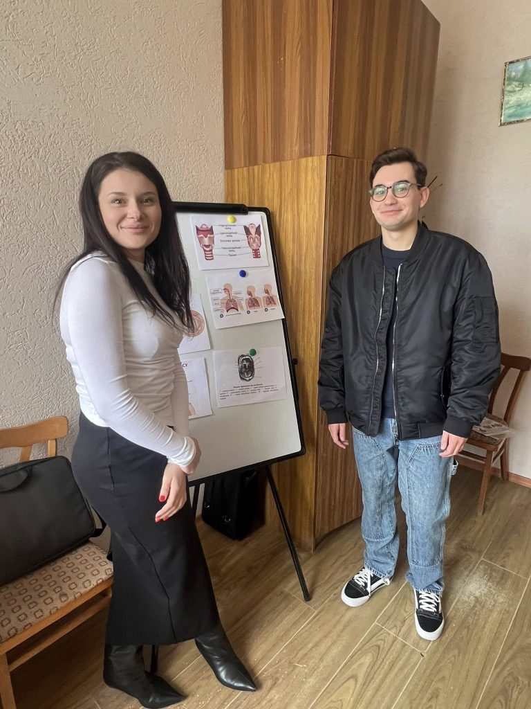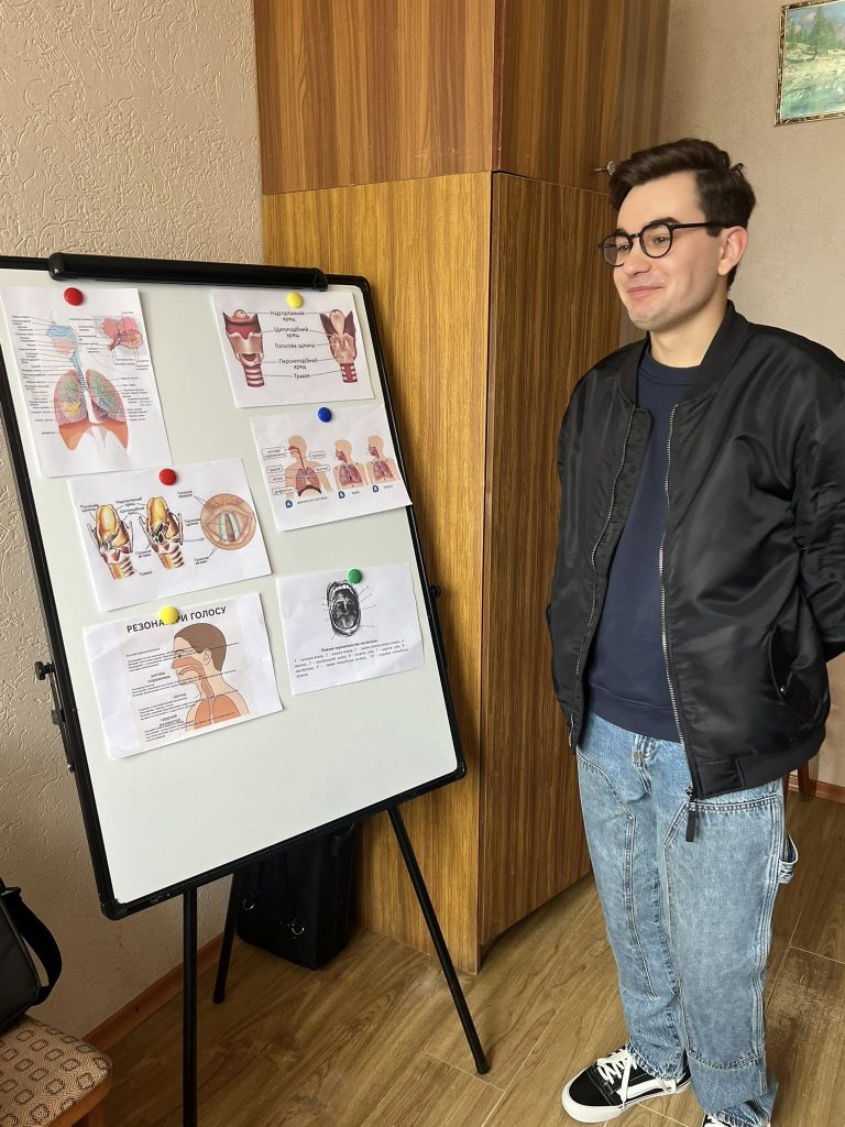 ОК-Вибіркова дисципліна «Основи вокальної майстерності» (викладач – докторка філософії, асистент кафедри Тетяна ЗадорожнаТаня Задорожна), здобувачі ОПП В5 «Музичне мистецтво», гр. ММ-32-Богдан Таранов, Катерина Мишаківська… Тема заняття: «Вивчення анатомічної структури голосового апарату»;